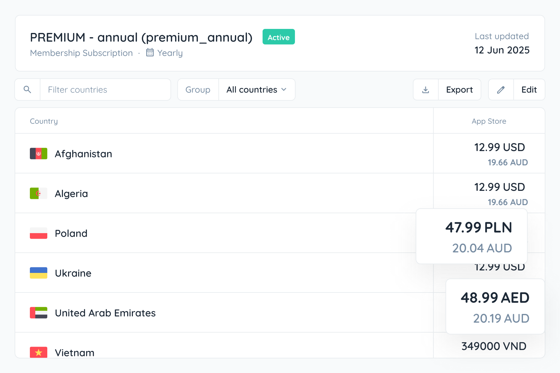 Our dashboard displays two critical numbers side-by-side: the local price (e.g., $1.99 MXN) and its converted value in your base currency (e.g., $0.10 USD). Finally understand your revenue's true worth.