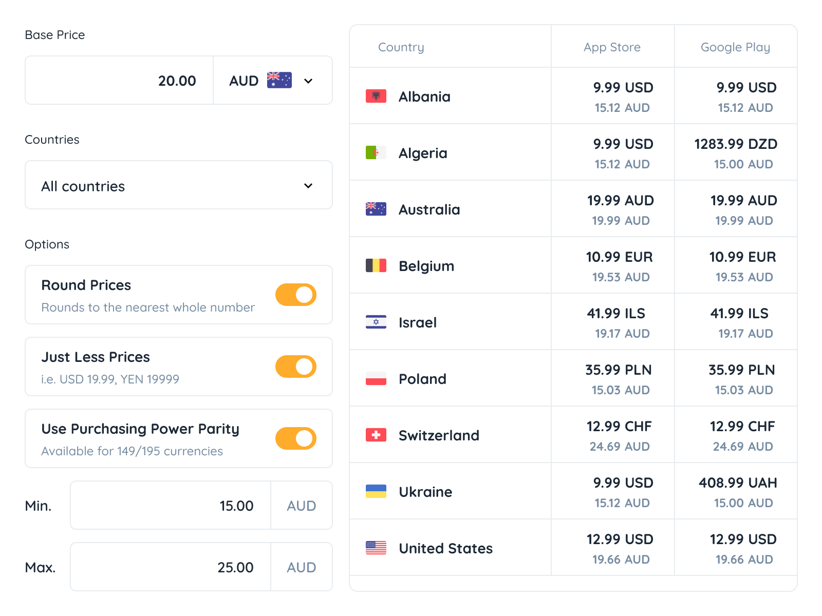 You're responsible for growth, and that means understanding the true value of your product in every market. AppsPricing gives you the insights and control to build a winning global pricing strategy.