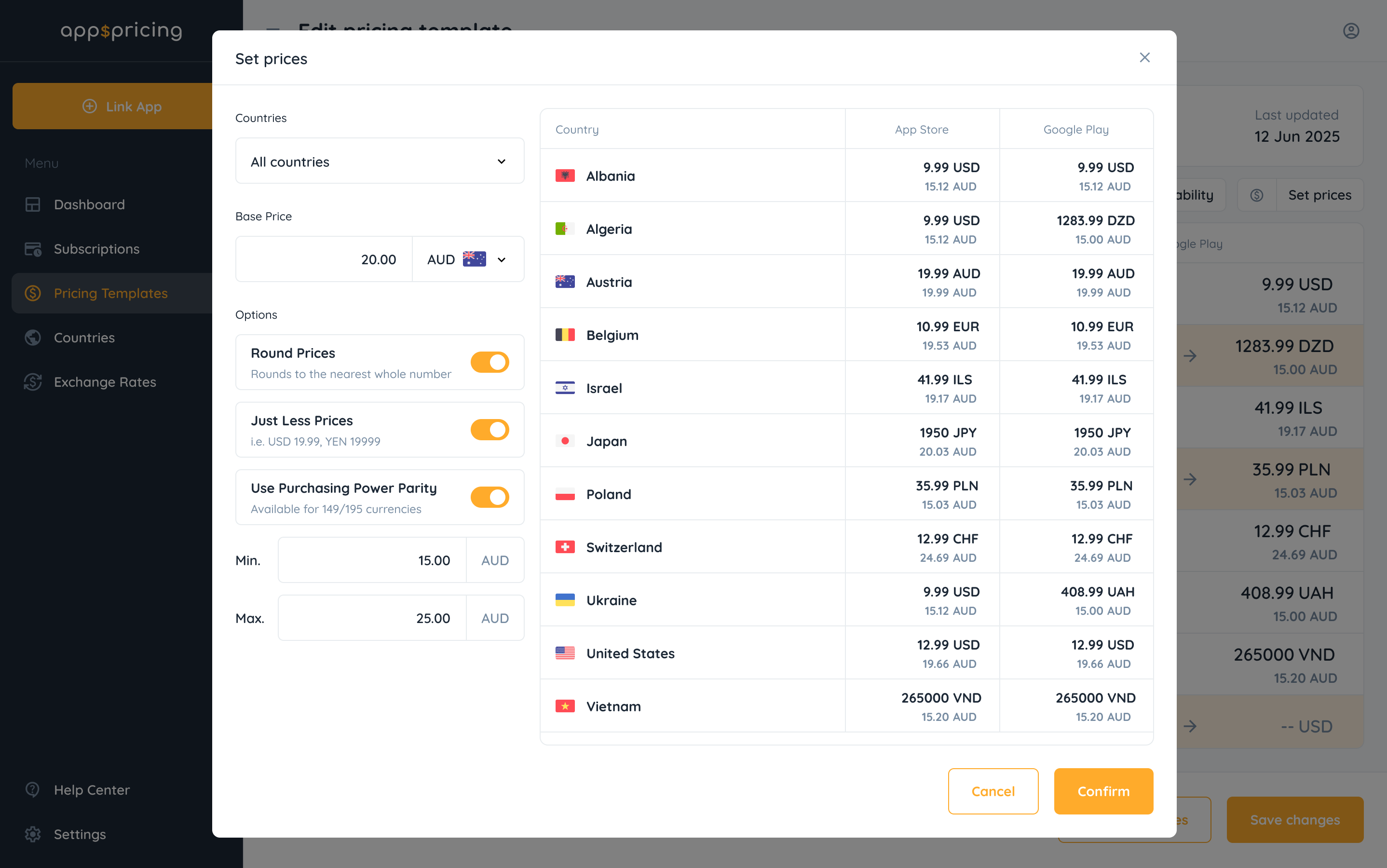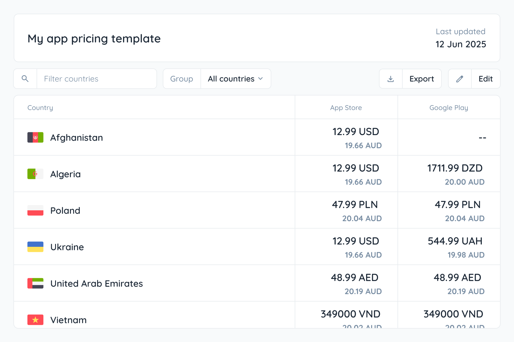 Define a pricing model once and save it as a reusable template. Include base price, PPP adjustments, rounding rules, and market-specific configurations. Perfect for maintaining consistency across your entire app portfolio.
